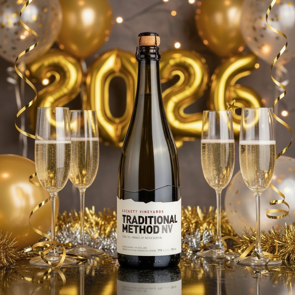 • This Non-Vintage Traditional Method sparkling is a 50/50 Cuvee of L’Acadie Blanc,